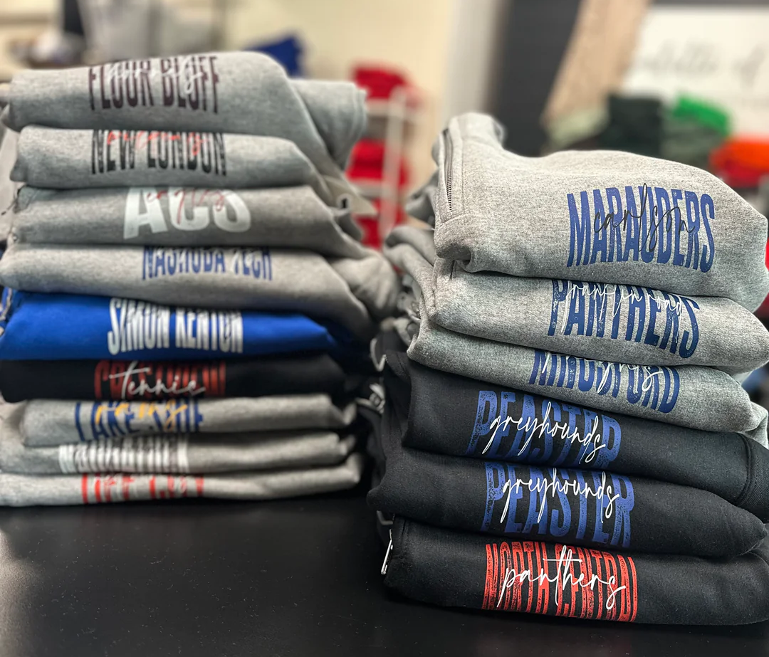 • Custom distressed varsity-style text prints (names, team/school initials, or locations)