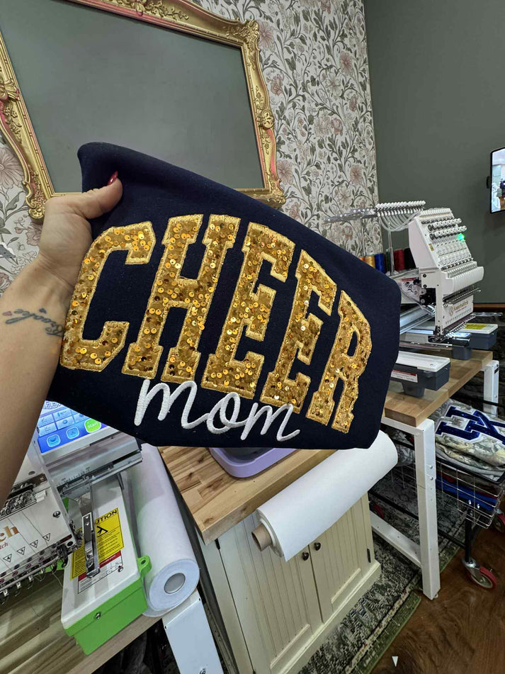 Personalize with "CHEER MAMA," a name, or any word – sparkling sequins that catch every light.