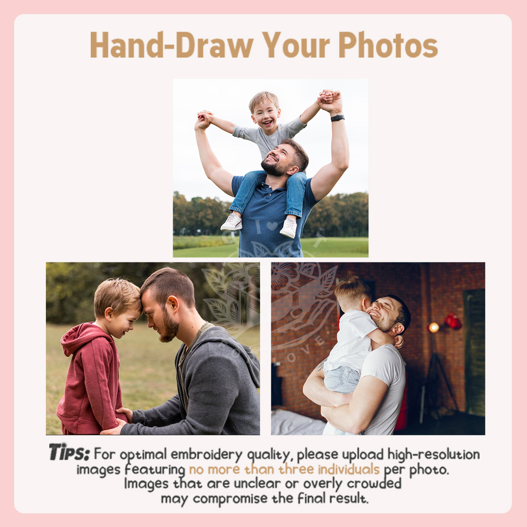 1.Upload your photo:Upload a photo and choose your preferred style (We have different colors, styles, etc.).For optimal embroidery quality, please upload high-resolution images featuring no more than three individuals per photo. Images that are unclear or overly crowded may compromise the final result.